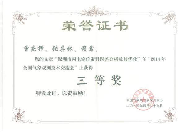 深圳市国家气候观象台选送了设施管理部曾庆锋等人撰写的《深圳市闪电定位资料误差分析及其优化》被列入大会技术经验交流会文集并推荐为大会交流的论文。该论文利用场地误差优化模式对深圳地区的地闪定位资料进行优化处理,它对提高闪电定位的定位精度等方面取得较好结果,对于其他地方的闪电定位质量控制和闪电定位网的建设工作有很好的指导意义,给各个领域的专家评委留下了深刻的印象,经专家多轮评审,该论文最终荣获会议论文三等奖。(深圳市国家气候观象台 郑涛)