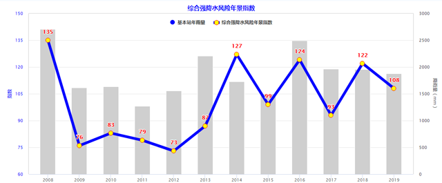 图:综合强降水年景指数与基本站年雨量对比,评价每年的暴雨年景